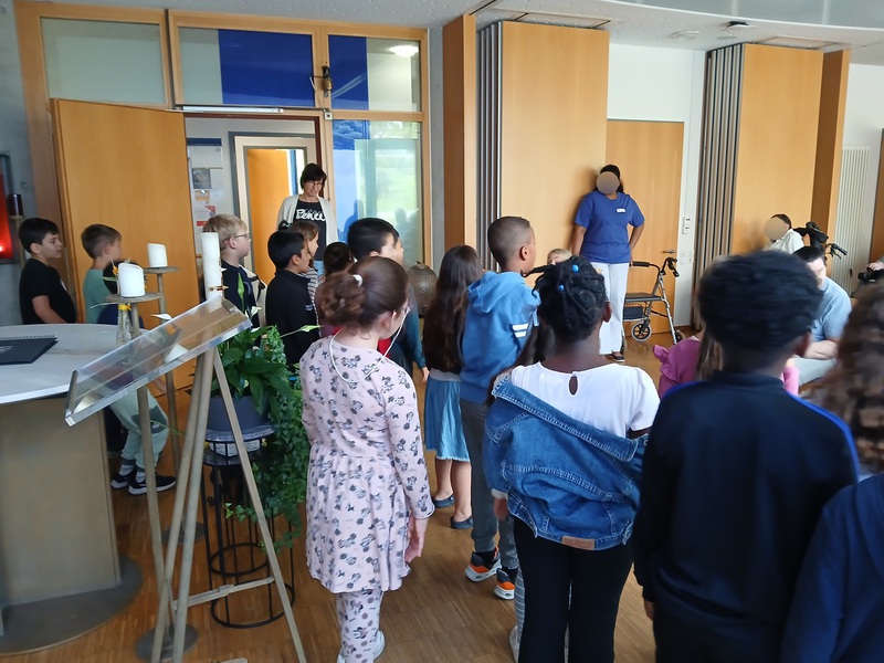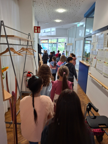 Die Klasse 1d besuchte am 8.7.2025 in Begleitung unserer Sozialarbeiterinnen Annette Haag und Anna Menti sowie ihrer Musiklehrerin Frau König das Seniorenzentrum Haus Augustinus in Sindelfingen. Es befindet sich nur ca. 5 min von der Grundschule Sommerhofen entfernt. So begann der zweite Teil des Schulvormittags an diesem Dienstag nach der großen Pause mit einem kleinen Spaziergang.